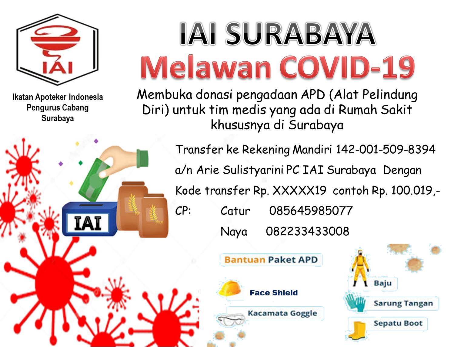 Dalam rangka melawan Covid-19, PC IAI Surabaya membuka donasi untuk pemberian APD (Alat Pelindung Diri) baik langsung kepada Rumah Sakit di Surabaya atau kepada masyarakat (rekening Mandiri a/n Arie Sulistyarini PC IAI Surabaya 142-001-509-8394 transfer dengan kode Rp. XXXX19 contoh Rp. 100.019) atau berupa barang bisa dikirim ke kantor PC IAI Surabaya Apartement Gunawangsa Merr Tower A lt. 2 no. 203. Konfirmasi ke Catur 085645985077 atau Naya 082233433008 atau Iin 081230892266