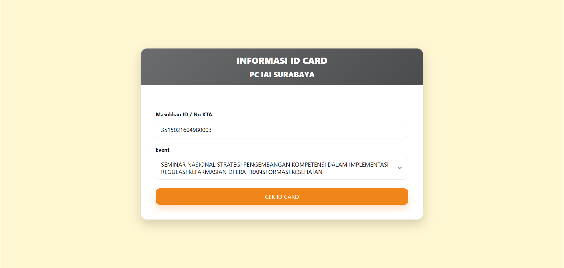 • Jika sudah, Lanjutkan dengan isikan data anda yang berupa Nomor ID Pendaftaran atau Nomor KTA anda yang dengan benar, dan pastikan setelah melakukan input tersebut, pilih terlebih dahulu nama event apa yang sedang anda ikuti. lakukan langkah seperti gambar dibawah ini.